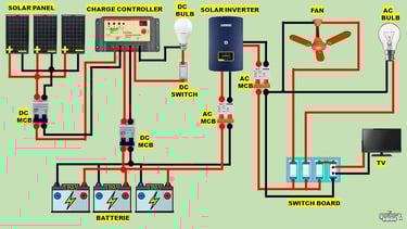 Solar Panels: Convert sunlight into DC electricity.